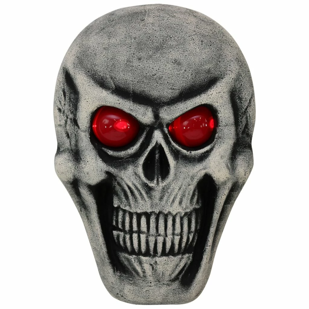 - 1.7-ft. skull Halloween decoration with red glowing eyes and battery operated for indoor/covered outdoor display