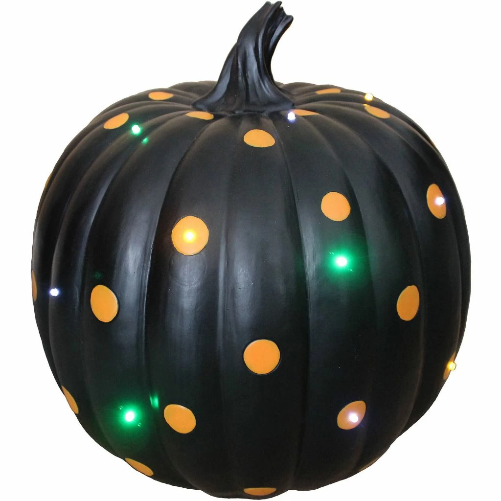 - Black resin pumpkin with orange polka dot design looks amazing
