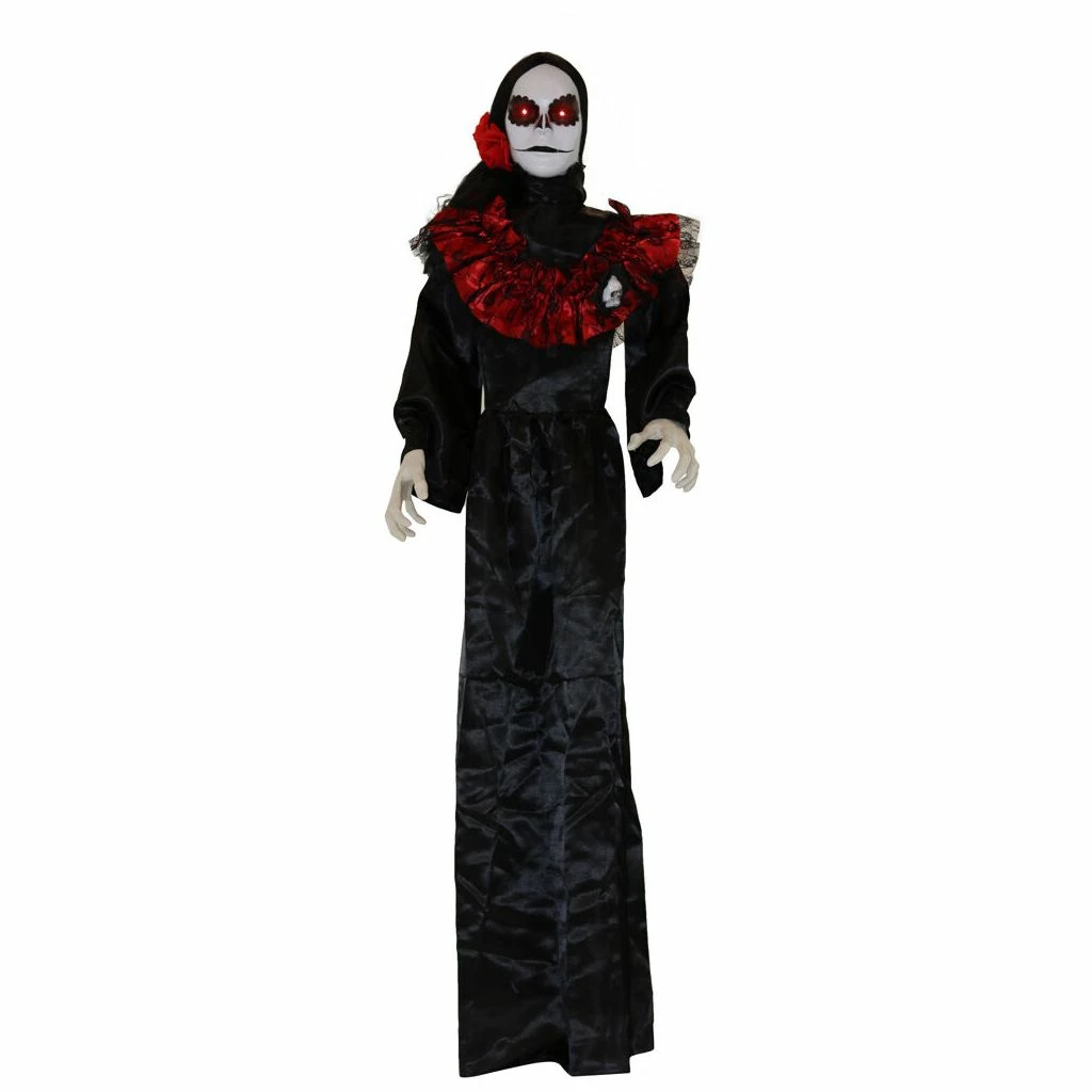 - 5-ft. sugar-skull inspired Day of the Dead skeleton animatronic with flashing red eyes and sound