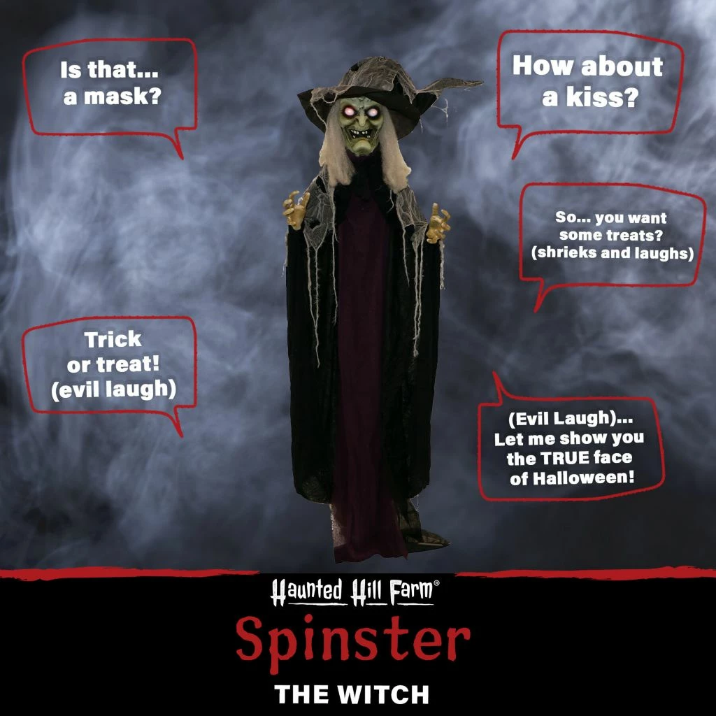- Spinster the standing witch is touch activated, her eyes flash red and she laughs wickedly, talks and shrieks