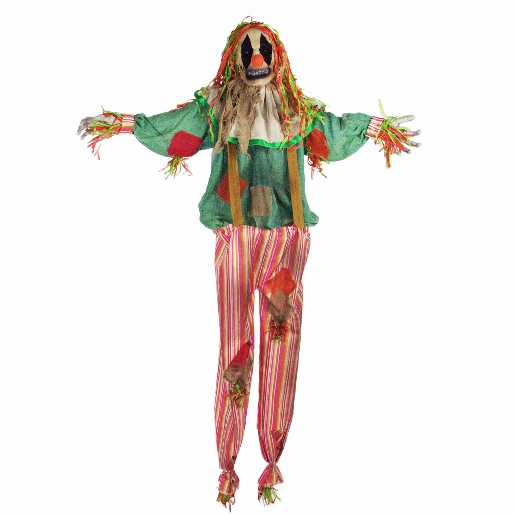 - 65-in. animatronic poseable scarecrow clown for indoor and covered outdoor displays